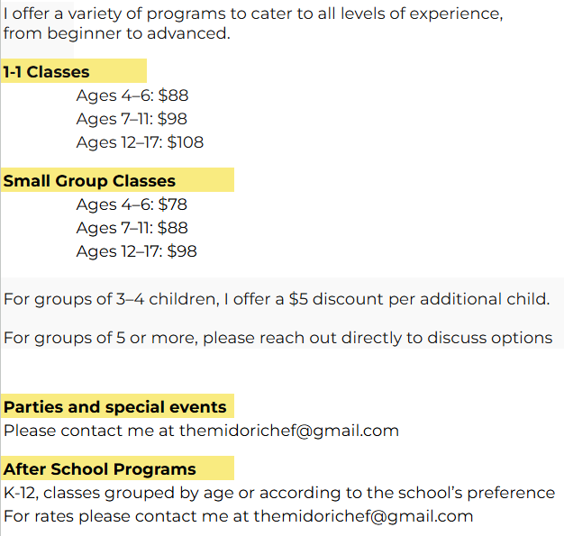 Book a 1-1 or group class at YOUR home. I help kids build cooking confidence and get excited to make food in your home kitchen.